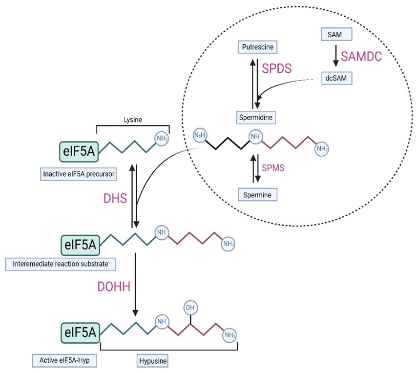 Rys. 1. Szlak poliaminy-hypuzyna-eIF5A. Modyfikacja reszty lizyny eIF5A do hypuzyny zachodzi poprzez dodanie fragmentu spermidyny (4-aminobutanalu) w dwóch kolejnych reakcjach enzymatycznych, skutkujących aktywacją czynnika translacyjnego eIF5A (Paluch-Lubawa i in. 2025)